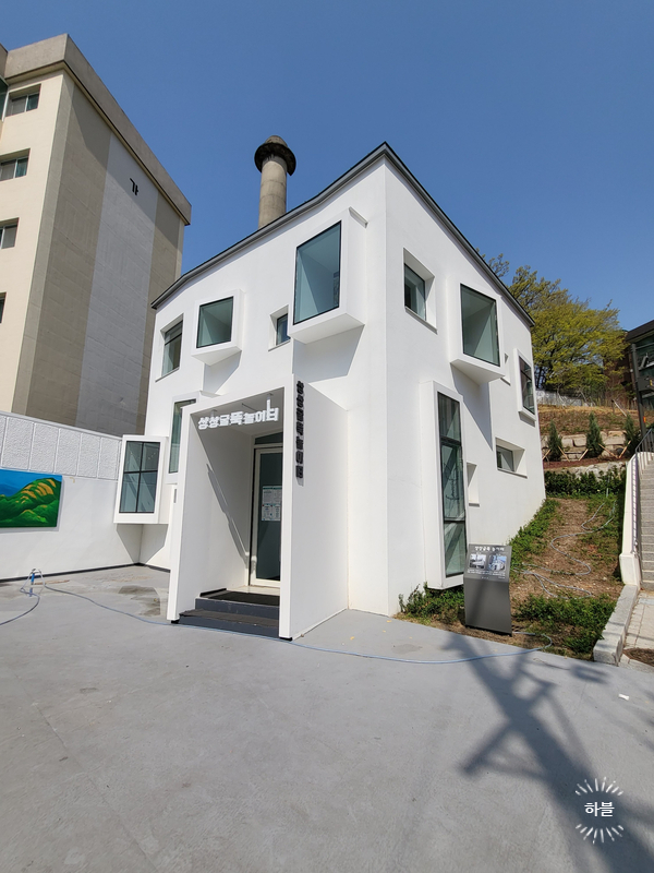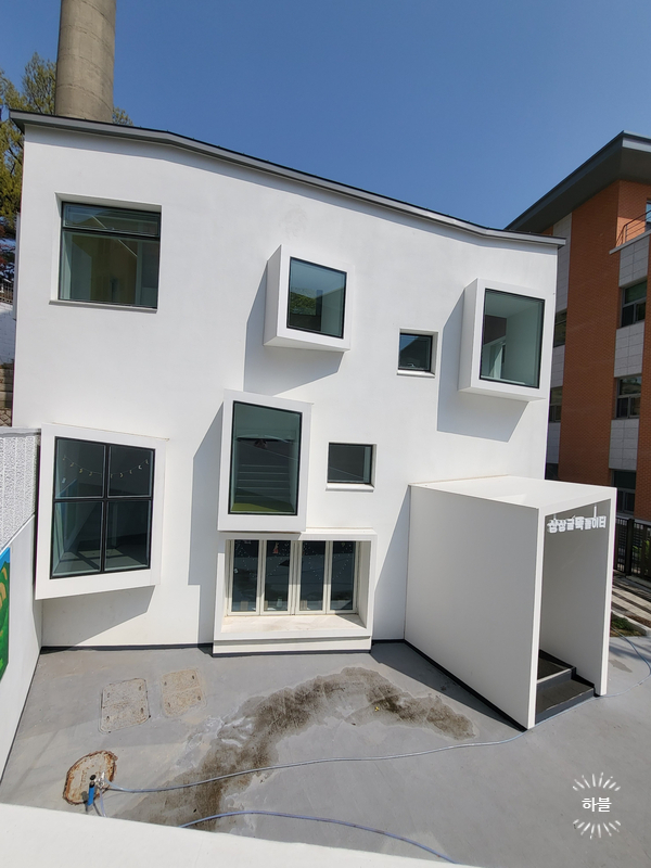 상상굴뚝 놀이터 외관인데요. 새하얗고 깨끗한 건물색깔과